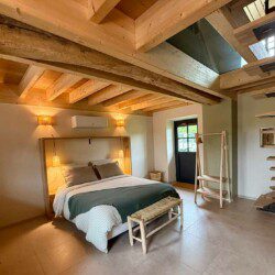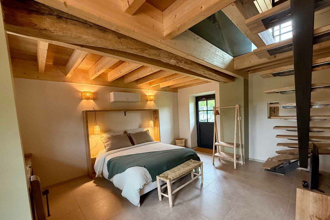 Ancienne petite grange/atelier, située à l’entrée du corps de bâtiments, elle est devenue une grande chambre familiale qui peut accueillir jusqu’à 4 personnes. 60m2 sur 2 niveaux. Une terrasse privée. Vue sur la nature. Au rdc, une première chambre avec lit Queen Size, salle de bain et les toilettes séparés. A l’étage, non cloisonné, une seconde chambre avec lit Queen Size pouvant être séparé en 2 lits individuels pour accueillir 2 personnes, enfants (de + de 8 ans) ou adultes. La maison est équipée d’une climatisation réversible.Formerly a small barn/workshop, located at the entrance to the main building, it has become a large family room that can accommodate up to 4 people. 60m2 on 2 levels. Private terrace. Views over the countryside. On the ground floor, a first bedroom with Queen Size bed, bathroom and separate toilet. Upstairs, not partitioned, a second bedroom with Queen Size bed that can be separated into 2 single beds to accommodate 2 people, children (over 8) or adults. The house is equipped with a reversible air-conditioning.